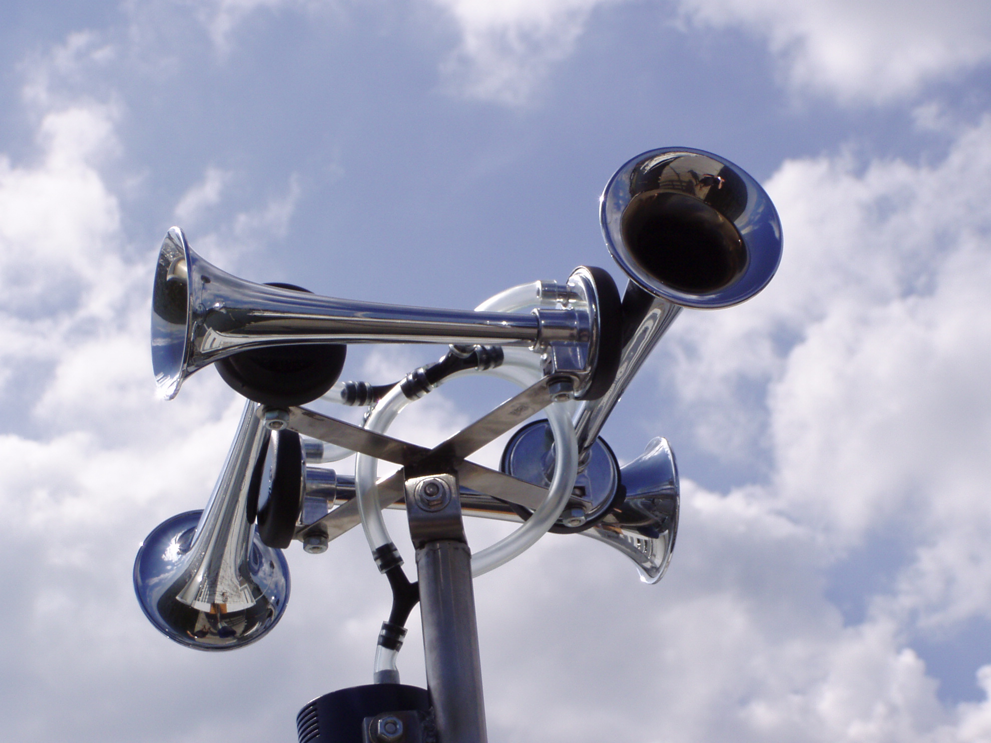 The trumpets are chrome plated metal and issue about the loudest blast that you can get from this class of horn. The next step up would be the high pressure truck type horn. This unit is meant to be mounted at the bow and comes with a 30 foot length of cable to the control unit for the race committee at the stern. The two things you need to provide are power, a 12 volt power pack located within six feet of the trumpets, and mounting surface, it comes with a flange that you need to mount (screw) on a surface. More pictures to come. The website is slowly getting updated. Call or email for specifics and questions. |